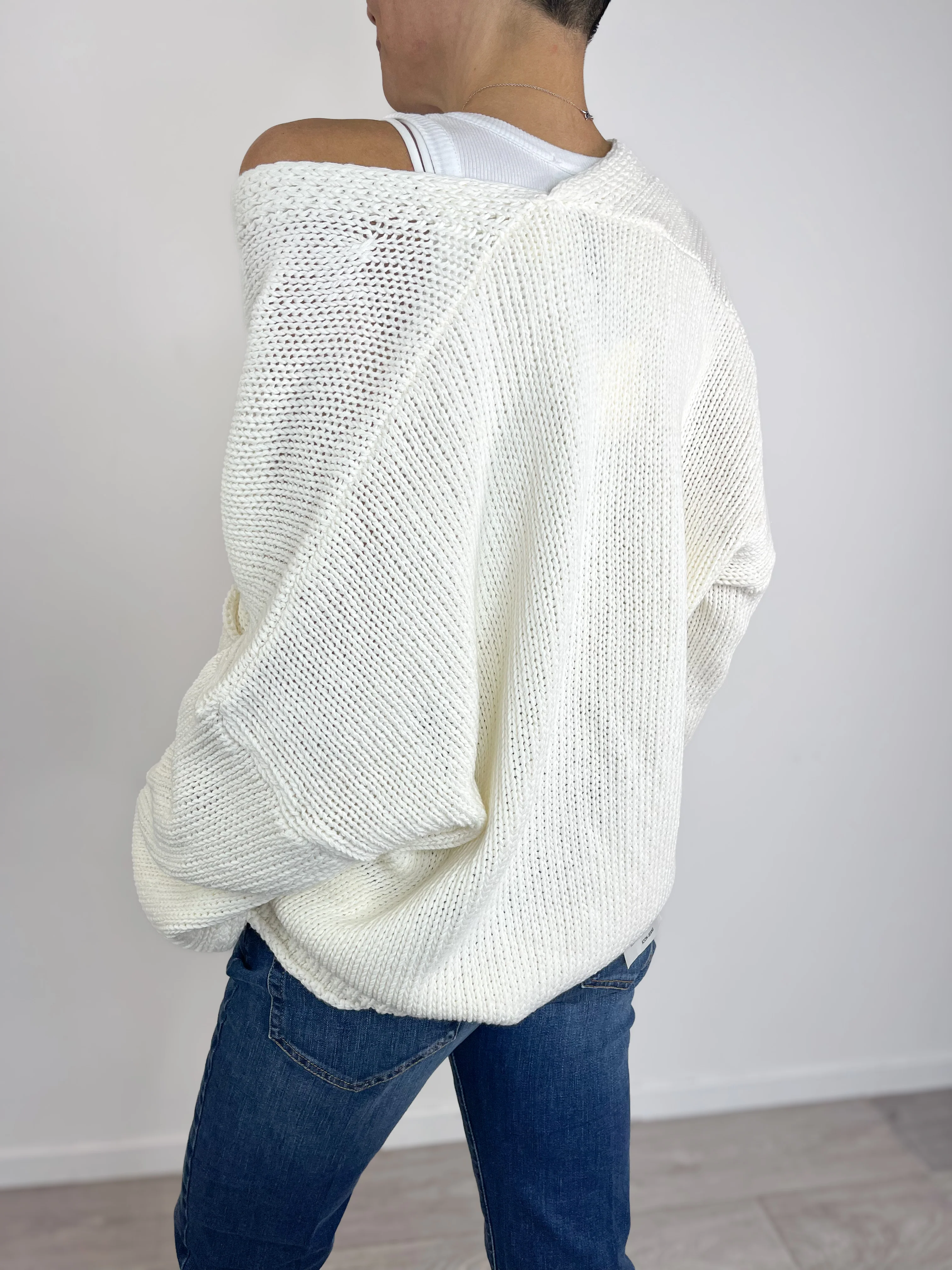Cardigan modello oversize, morbido, con scollo a V e maniche lunghe. Dettaglio finiture in maglia a costine. Chiusura frontale con bottoni tartarugati. Tasche frontali.Â